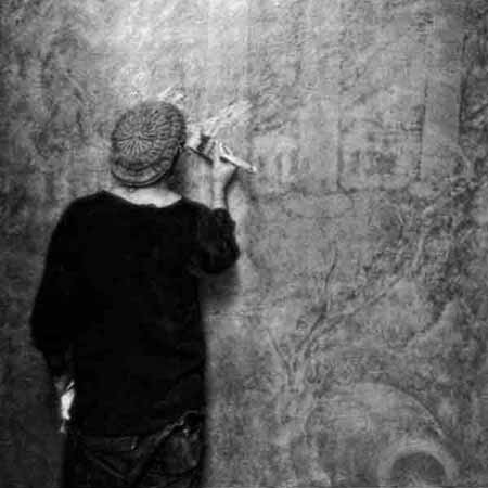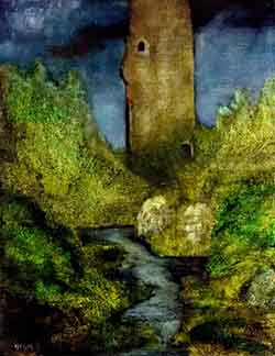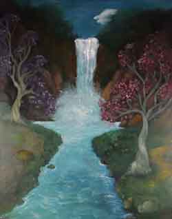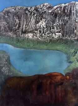 “...the ritual of painting all begins with the void; entering the spacial entity of nothingness and building a bridge for the imagination to move onward. Instinctively the web of colored lines weave their abstractions toward the harmony of conceptual scenery. The initial mark, the phantom image born, will mutate into mountain, tree, a body of water and sky, a figure may appear if conditions allow. Herein lies the most crucial decision: What wishes to be seen and what shall remain hidden? I try to preserve the phantom image, indicating the pathways leading outside the maze. At times stokes will disappear, leaving no trace of how we arrived. By using abstraction as a means to repress former or future thoughts, that is, during the long hours of painting, allows the image to reveal itself carefully, layer by layer, with no judgement as to what it will become. This improvisation, influenced by the last form of color, represents another new beginning, and at the same time furthers the detail closer toward the realm of an ideal work.The artist travels ever deeper into the void discovering it a void no longer but an atmosphere filled with knowns and unknowns, lights and shadows. All that exists in reality is interchangeable with the unreal, that is, what we do not see, but whose presence we feel. In the transference of energy between what is felt by the artist, while in the trance of visualization, and what is channelled to the viewer, through the radiation of this energy, a hypnotic relationship occurs.